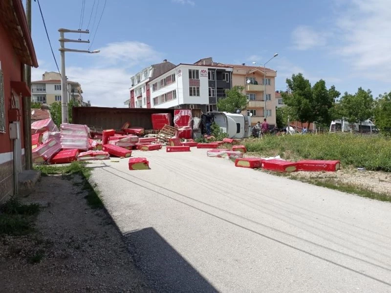Eskişehir’de, izolasyon malzemesi taşıyan tır, kontrolden çıkarak yan yattı. Kazada, tır sürücüsü hafif yaralandı.