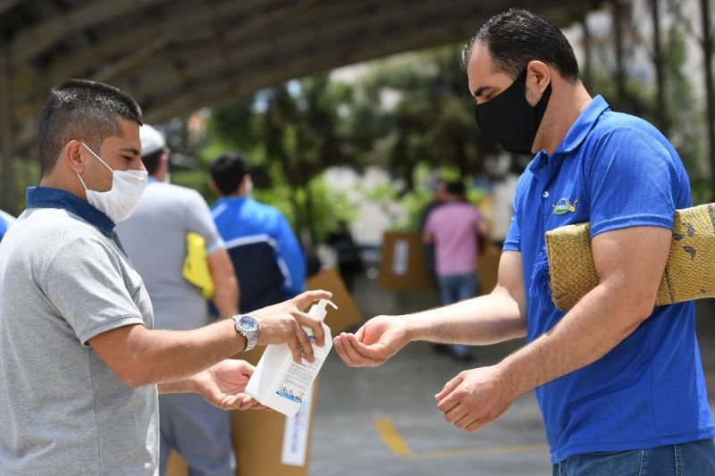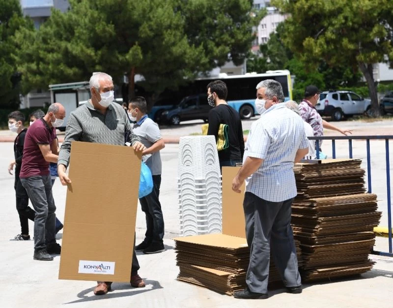 Konyaaltı Belediyesi, 74 gün sonra cuma namazı ile yeniden ibadete açılan cami avluları ve namaz kılınan pazar yerlerinde vatandaşlara maske ve üzerinde namaz kılınması için tek kullanımlık karton dağıttı.