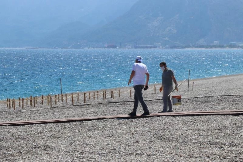 Konyaalti Plaji'nda, denize girip, plajda güneslenecek yerli ve yabanci turistler için Kovid-19 tedbirlerine uygun yapilan düzenleme sürüyor.