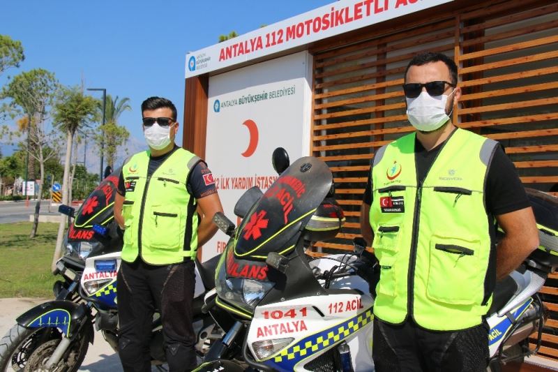 Antalya Büyükşehir Belediyesi ile İl Sağlık Müdürlüğü arasında yapılan protokol kapsamında Konyaaltı Sahili’nde 112 Motosikletli Acil Sağlık Ekipleri hizmet vermeye başladı. Sahil boyunca devriye gezen motosikletli sağlık ekipleri rahatsızlanan vatandaşlara anında müdahale ediyor.