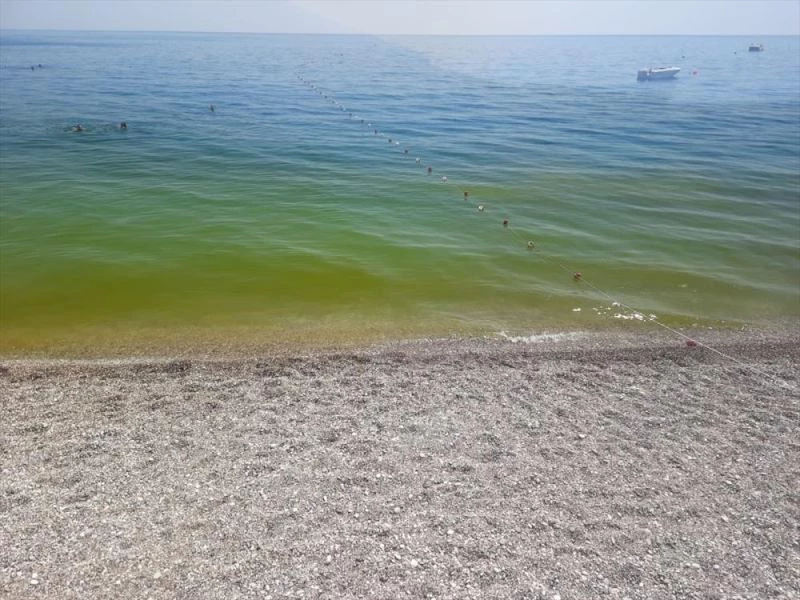 Yaz aylarinda her gün binlerce yerli ve yabanci tatilcinin tercih ettigi Konyaalti Sahili'nin bir bölgesinde, öglen saatlerinden itibaren deniz suyunun rengi yesile dönüsmeye basladi.