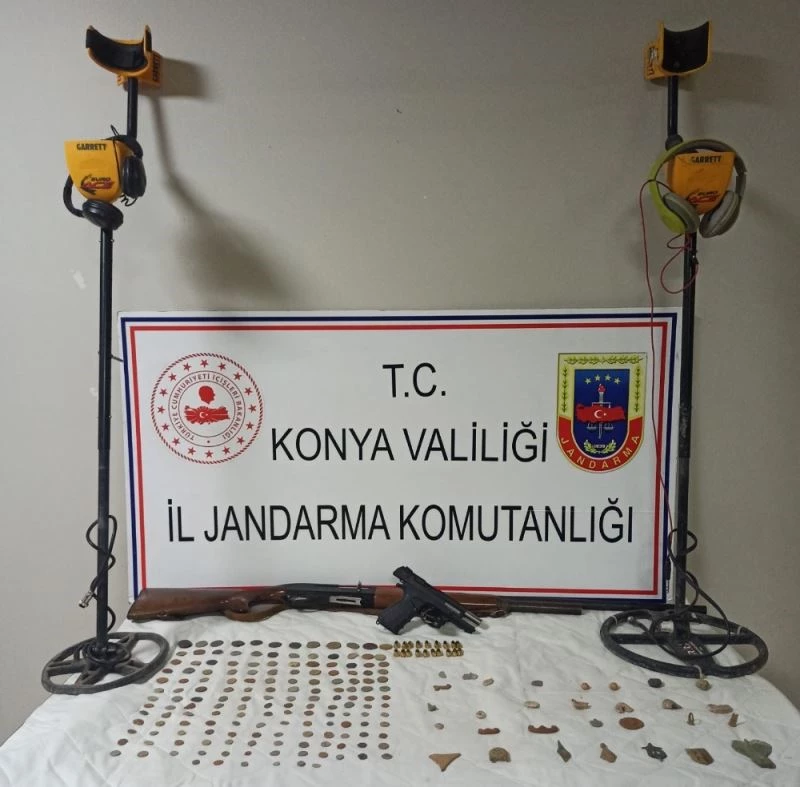 Edinilen bilgiye göre, Konya İl Jandarma Komutanlığı ekipleri Beyşehir’e bağlı Bayavşar Mahallesi’nde K.T. isimli şahsın dedektör ile bulduğu tarihi obje ve sikkeleri evinde sakladığını tespit etti. Ekipler alınan arama kararına istinaden şahsın evi ve eklentilerinde arama yaptı. Yapılan aramada 165 adet sikke, 29 adet metal obje, 1 adet yüzük, 2 adet dedektör, 1 adet tabanca ile 19 adet mermisi ve 1 adet ruhsatsız av tüfeği ele geçirildi.