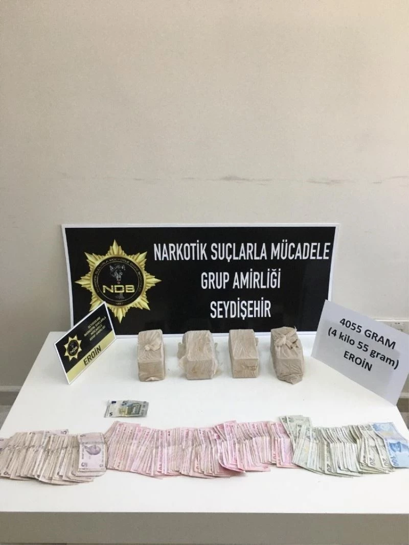 Edinilen bilgiye göre, İl Emniyet Müdürlüğü Seydişehir Narkotik Suçlarla Mücadele Grup Amirliği ekipleri tarafından bir araçta yapılan aramada 4 kilo 55 gram eroin ele geçirildi. Ayrıca araçta bulunan 2 bin 850 lira ve 5 euro paraya da el konuldu. Gözaltına alınan Ş.A. (45), U.B. (28) ve 18 yaşından küçük 1 kişiye uyuşturucu madde ticareti yapmak ve nakletmek suçundan işlem yapıldı. Şüphelilerden U.B’nin değişik suçlardan hakkında yakalama kararı da bulunduğu öğrenildi.