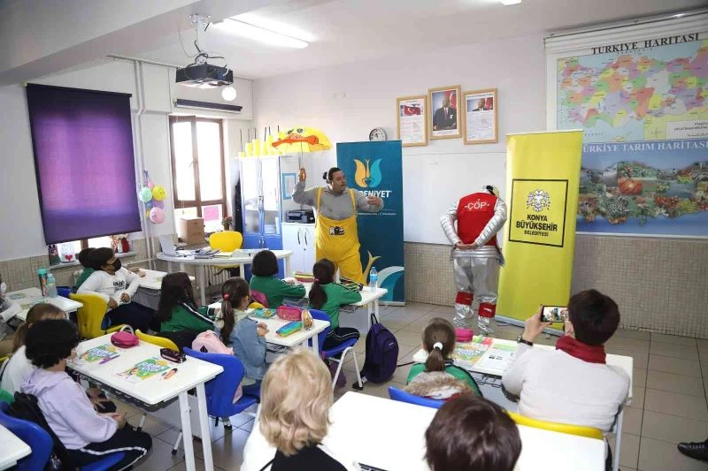 Konya Büyükşehir Belediyesi Medeniyet Okulu Projesi kapsamında şehir genelindeki 4. ve 5. sınıf öğrencilerine yönelik sürdürülen çat kapı tiyatroları ile su tasarrufu, sıfır atık ve geri dönüşüm konularında bilgilendirme yapıyor.