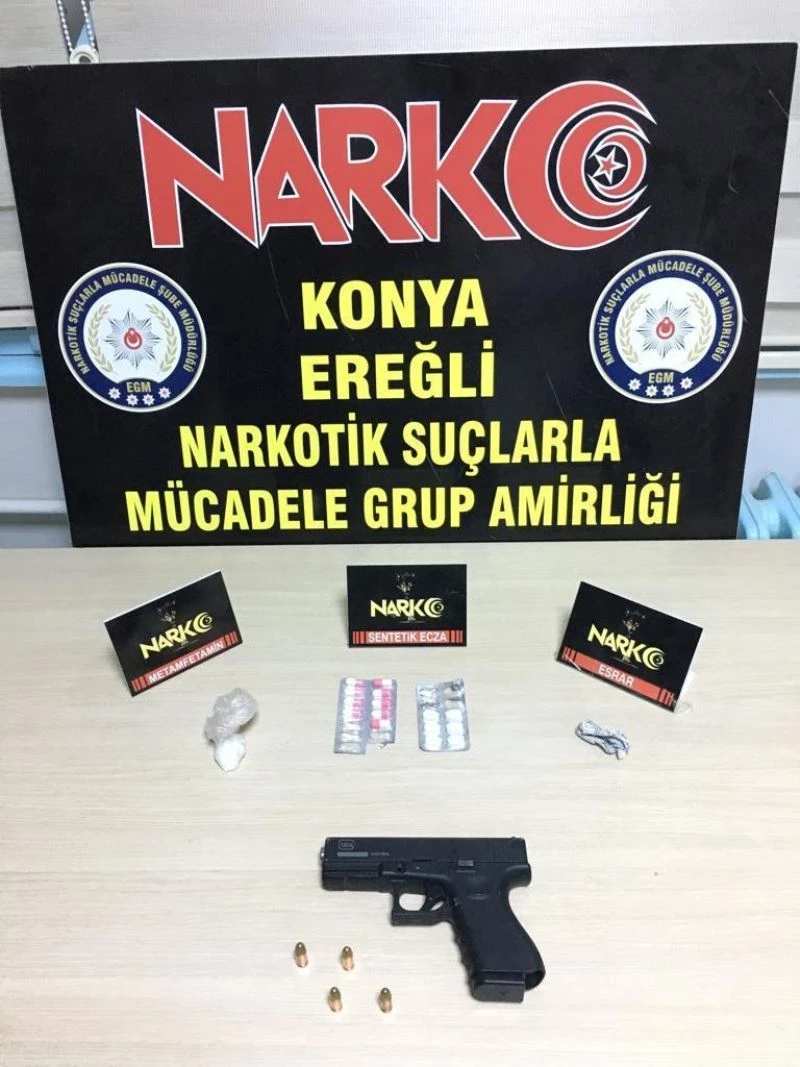 Edinilen bilgiye göre, Konya İl Emniyet Müdürlüğü ekipleri Konya’ya uyuşturucu getiren ve piyasaya uyuşturucu süren kanalların tespitine yönelik çalışmalarına devam ediyor. Ereğli Cumhuriyet Başsavcılığının koordinesinde Narkotik Şube ve Ereğli İlçe Emniyet Müdürlüğü ekipleri, yapılan çalışmalar çerçevesinde belirlenen adreslere sabah saatlerinde eş zamanlı operasyon düzenledi. Yapılan operasyonda 21 şüpheli şahıs yakalanarak gözaltına alındı. Şahısların ev ve iş yerlerinde yapılan aramalarda 120 gram metamfetamin maddesi, 350 adet uyuşturucu hap, bir miktar esrar ile eroin, 8 kök Hint keneviri, uyuşturucu ticaretinde kullanılan 2 adet hassas terazi, 2 adet uyuşturucu kullanma aparatı, 2 adet kuru sıkı tabanca, 1 adet av tüfeği ve çok sayıda fişek ele geçirildi.