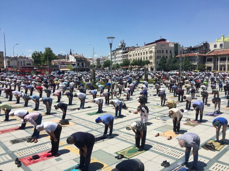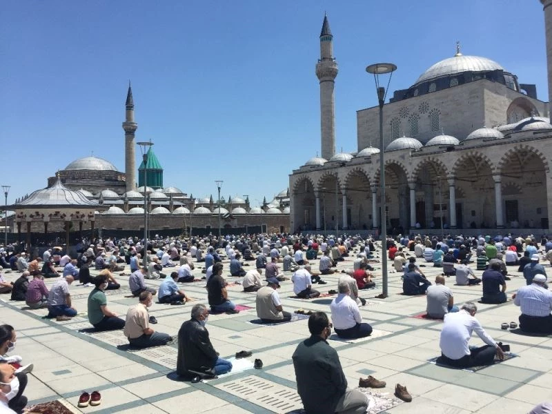 Korona virüsle (Covid-19) mücadele kapsamında alınan tedbirler, normalleşme sürecinin başlamasıyla birlikte yumuşatılmaya başladı. 16 Mart’tan bu yana kapalı bulunan camiler geçtiğimiz günlerde ibadete açıldı. Bu kapsamda Konya’da hijyen, sosyal mesafe gibi kurallar da göz önünde bulundurularak ikinci cuma namazı için vatandaşlar camilere akın etti. Cuma namazlarının cami avlularında kılınacağının belirtilmesinin ardından yüzlerce vatandaş Mevlana Meydanı’nda bir araya geldi. Vatandaşların sosyal mesafeye uyarak kıldığı cuma namazında cemaatin arası en az 1 metre olarak ayarlandı. Cuma namazı için Mevlana Meydanı’nda yer bulamayan vatandaşlar yanında getirdikleri seccadelerini yollara ve kaldırımlara sererek cuma namazını kıldı.