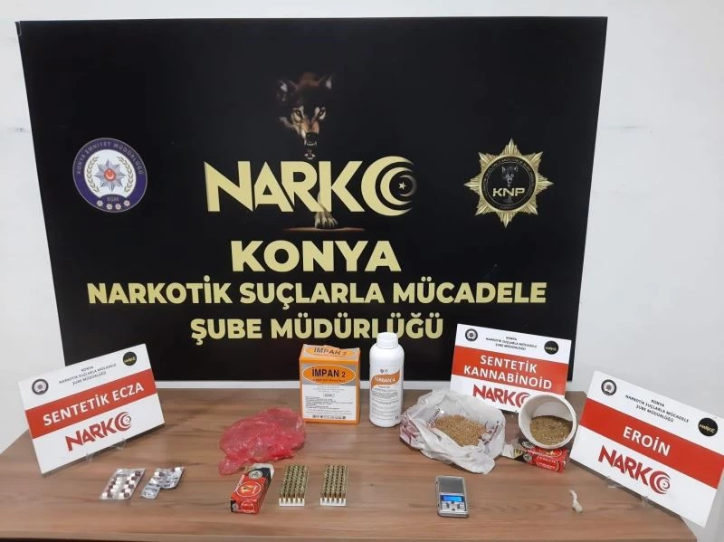 Edinilen bilgiye göre, Konya İl Emniyet Müdürlüğü Narkotik Suçlarla Mücadele Şube Müdürlüğü ekiplerinin sokak satıcılarına yönelik yaptığı detaylı çalışmalar neticesinde, Çelebi, Sahibiata, Tatlıcak ve Alakova mahallelerindeki ikametlerde ve Ankara Yolu uygulama noktasında bir araçta yapılan aramalarda uyuşturucu madde ele geçirildi. Narkotik ekiplerinin titiz çalışmaları sonucunda 4 ikamet ve 1 araçta yapılan aramalarda, 550 gram metamfetamin, 130,5 gram eroin, 53 adet uyuşturucu hap, 88 gram tütüne emdirilmiş uyuşturucu madde, uyuşturucu yapımında kullanılan 2 parça sıvı-toz ve 75 gram sentetik madde ele geçirildi. Uyuşturucu ticaretinde kullanılan 1 adet hassas terazi, 100 adet silah mermisi ve 25 bin 890 TL’ye de el konuldu.