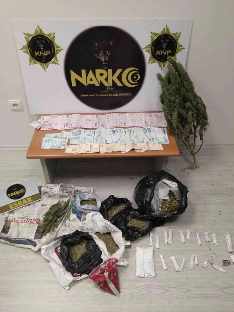 Akşehir İlçe Emniyet Müdürlüğü Narkotik Suçlarla Mücadele ekipleri, yaptıkları çalışmalar kapsamında bir araçta uyuşturucu madde olduğu yönünde bilgi elde ederek aracı takibe aldı. Aracı D-300 karayolu üzerinde durduran narkotik ekibi, araçta bulunan L.C. isimli şahsı gözaltına aldı. Araçta yapılan aramada 5 gram esrar maddesi ele geçirildi. Devam eden soruşturmada L.C.’ye uyuşturucu maddeyi sattığı tespit edilen M.A. ve A.T. de gözaltına alındı. Akşehir Cumhuriyet Başsavcılığı’nın koordinesinde operasyonu genişleten narkotik ekibi, M.A.’nın evinde yaptığı aramada, parçalar halinde toplam 900 gram esrar maddesi ve 2 bin 609 gram kenevir tohumu ele geçirdi. A.T.’nin evinde yapılan aramada ise 7 gram kenevir tohumu ele geçirildi. Ayrıca şahıslarda bulunan uyuşturucu parası olduğu değerlendirilen 36 bin 250 TL’ye de el konuldu. L.C. isimli şahıs, alınan ifadesinin ardından serbest kalırken, M.A. ve A.T. sevk edildikleri mahkemece tutuklanarak cezaevine gönderildi.
