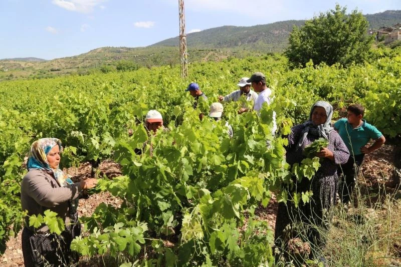 Bir bağdan sofralık üzüm, kuru üzüm, pekmez ve yaprak üretimi yapıldığını anlatan Topal, "Bizim ilk hasadımız yapraktır. Yaprağı yaklaşık 3 sefer yolarız. Bugün ikinci yolumu yapıyoruz. 10-15 gün sonra son yolumu yapacağız ve yaprak sezonunu kapatacağız. Bizim yaprağın bir özelliği var. ‘Hafızali’ dediğimiz bir cinsten yaprak üretiyoruz. Bu cins her yerde yetişmiyor. Bunun özelliği yaprağı parlak, damarsız ve ekşi olmasıdır. Aroması farklı olduğu için limona ihtiyaç duyulmaz. Diğer cinslerden elde edilen yapraklara muhakkak limon sıkılması lazım ama bizim bu yapraklara gerek yok. Tarlada satış fiyatımız yaklaşık olarak 25 liradır. Yaprak hasadı bittikten sonra üzüm hasat ederiz. Üzümün öncelikle satışını yaparız. Kalanı da pekmezini yaparız” dedi.