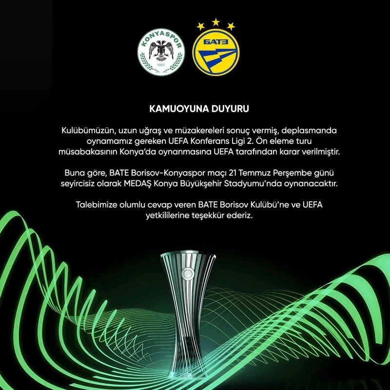 Konyaspor Kulübü’nden yapılan açıklamada, “Kulübümüzün, uzun uğraş ve müzakereleri sonuç vermiş, deplasmanda oynamamız gereken UEFA Konferans Ligi 2. Ön eleme turu müsabakasının Konya’da oynanmasına UEFA tarafından karar verilmiştir. Buna göre, BATE Borisov-Konyaspor maçı 21 Temmuz Perşembe günü seyircisiz olarak Konya Büyükşehir Stadyumu’nda oynanacaktır. Talebimize olumlu cevap veren BATE Borisov Kulübü’ne ve UEFA yetkililerine teşekkür ederiz” ifadeleri kullanıldı.