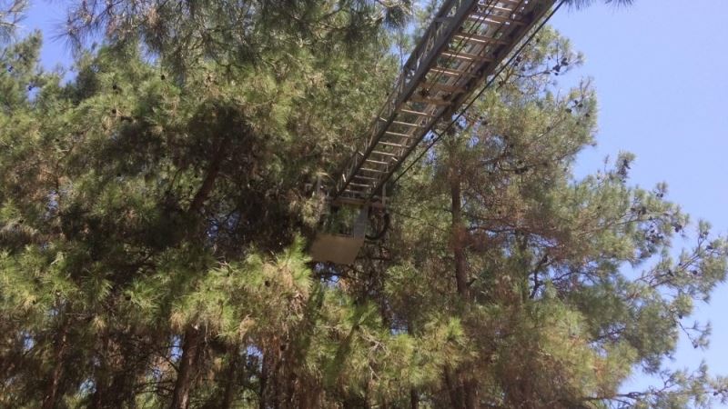 Osmaniye’nin Kadirli ilçesinde köpeklerden korkarak çam ağacına çıkan kedi, tırmandığı ağaçtan inemeyince itfaiyeciler tarafından kurtarıldı.