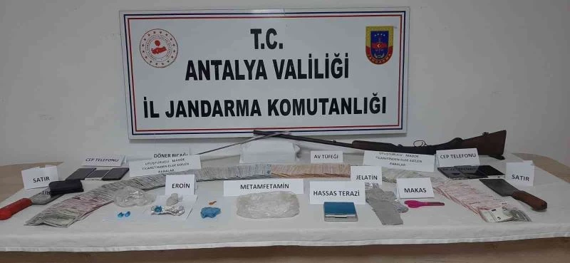 Antalya’da jandarma ekiplerinin ihbar üzerine operasyon düzenlediği evde çok miktarda uyuşturucu madde ile ateşli silah ve döner bıçağı ele geçirildi. Operasyonda 68 bin 510 TL uyuşturucu ticaretinden elde edildiği düşünülen para da bulunurken, olay anında uyuşturucu madde almak isteyen 4 kişi ile birlikte toplamda 8 kişi yakalandı. Yakalanan 8 kişiden 4’ü gözaltına alındı.