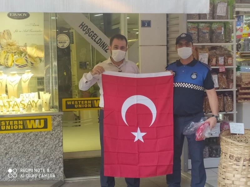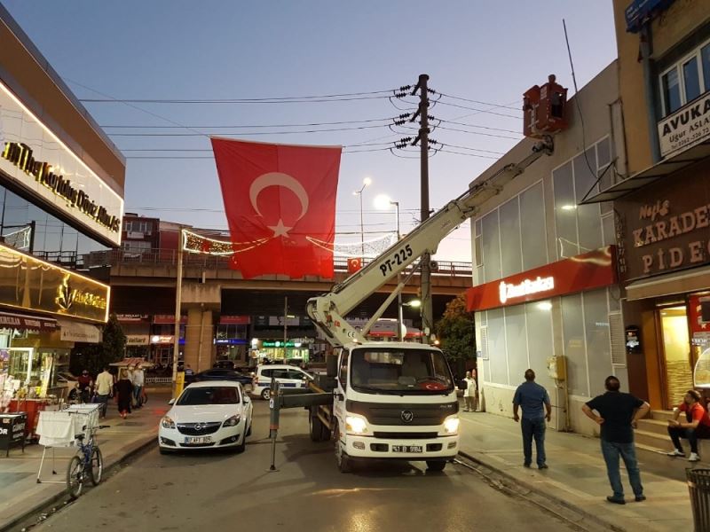 Körfez Belediyesi esnafa bayrak dağıtımı gerçekleştirirken, ilçenin en işlet caddelerinin giriş ve çıkışlarına da dev Türk bayrakları astı.