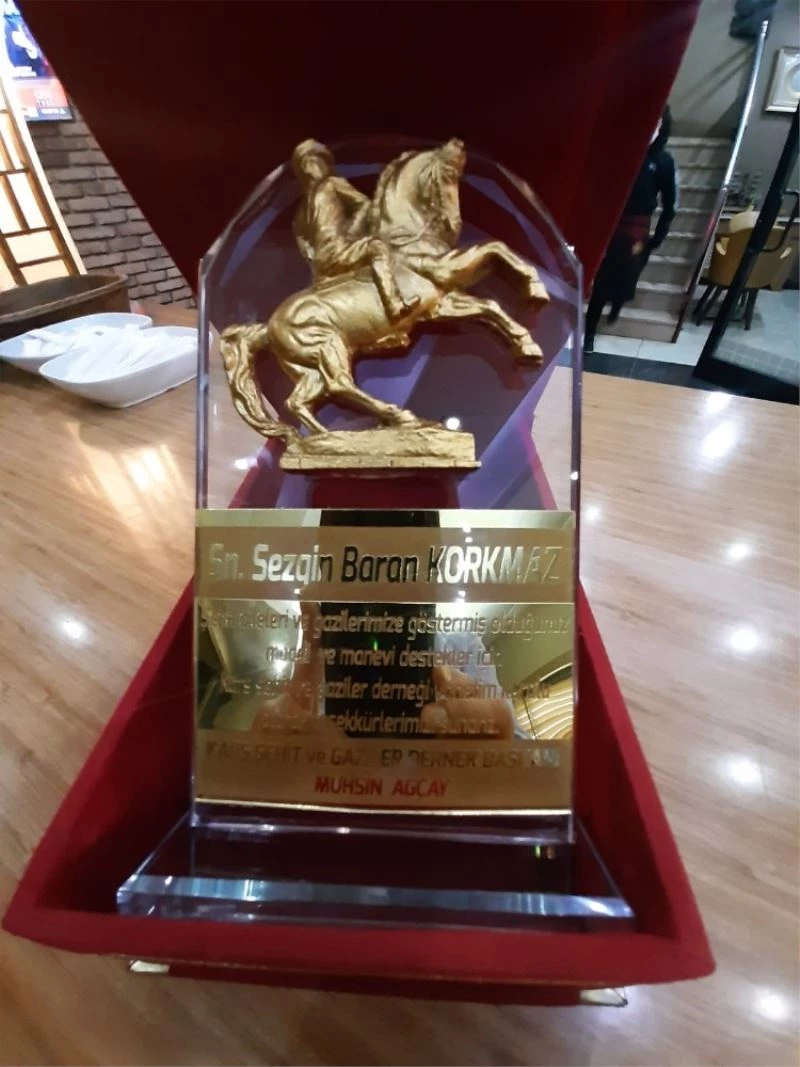 Kars Şehit ve Gazi Aileleri Derneği Başkanı Muhsin Ağçay tarafından SBK Holding Yönetim Kurulu Başkanı Sezgin Baran Korkmaz’a plaket verildi.