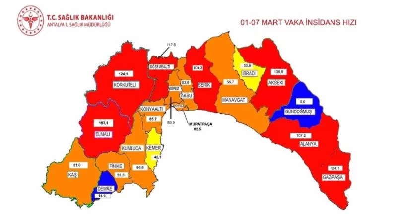 Antalya İl Sağlık Müdürlüğü tarafından paylaşılan 1-7 Mart dönemi vaka dağılımı tablosuna göre çok yüksek riskli ilan edilen Korkuteli ilçesinde son 2-3 haftada vaka sayısında yüzde 70 oranında artış yaşandı. İlçe Sağlık Müdürü Dr. Oya Dirican, insanların artık sıkılmaya başladığı için kurallara uymadığını söyleyerek, ilçede mutasyonlu virüs olduğu bilgisini de paylaştı. Virüsün 10-15 gün içinde dağıldığına ve özellikle ev ziyaretlerinden kaynaklandığına dikkat çeken Dirican, "Karşılıklı sokakta çay-sigara içimi, konuşmalarda hava akımı az olunca artış gösterdi. Biz özellikle ilçemizde maskeye çok önem vermeliyiz. Maske ve sosyal mesafe çok önemli. Karşılıklı konuşurken muhakkak maske olması lazım. Özellikle gözden de bulaşıyor. Korona virüsten korunmak için vatandaşların kalabalık ortamlardan kaçınması lazım. Artış başladığı zaman vakalar katlanarak çığ gibi büyüyor. O yüzden vatandaşların çok daha dikkatli olması gerekiyor” dedi.