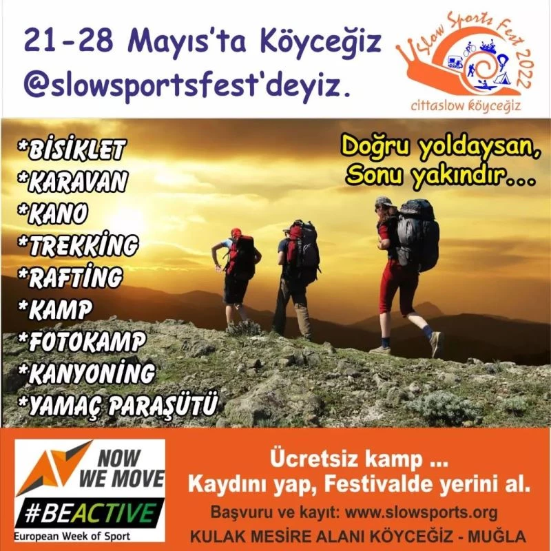 Slowsports Festivali, yasal ve organizasyon sorumluluğu Su ve Doğa Sporları Dayanışma Derneği (SUDOSD) ve Köyceğiz Turizm İşletmecileri Derneği tarafından üstlenilen Muğla Büyükşehir Belediyesi, Köyceğiz Kaymakamlığı ve Köyceğiz Belediyesi çözüm ortağı olduğu etkinlik altmışa yakın doğa ve spor derneği tarafından destekleniyor. Her kentin kendine özgü bir rengi, lezzeti, kokusu, dokusu olduğunu, yerel değerleri korumayı ve gelecek kuşaklara aktarmayı amaçlayan Cittaslow hareketinin üyesi olan Köyceğiz, dünyada ilk kez düzenlenen Slowsports Fest’e 21-28 Mayıs tarihleri arasında ev sahipliği yapacak. Slowsports Fest kamp, karavan, trekking, bisiklet, kano, rafting, canyoning ve yamaç paraşütü, photocamp ve atölye çalışmaları, sergi, konser ve etkinlikleri bir araya getirecek.