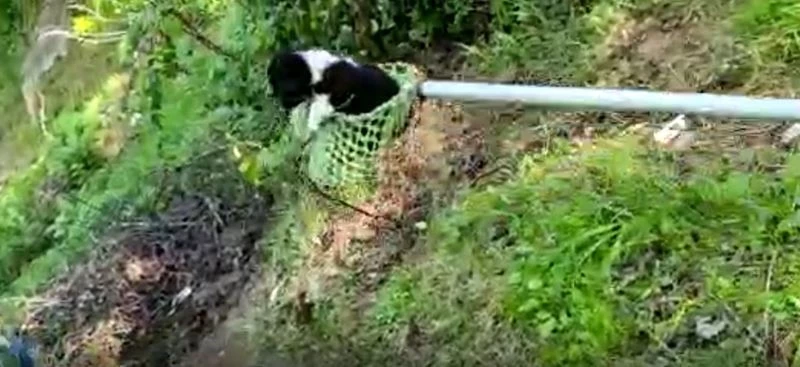 Rize’nin Ardeşen ilçesi Akkaya köyünde uçurumdan aşağı yuvarlanan yavru köpek mahallede yaşayan vatandaşlar tarafından yöreye özgü meyve toplama aparatı ‘Mosakale’ ile kurtarıldı.