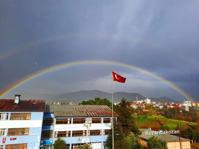 Kozan’da akşam saatlerinde aniden bastıran sağanak yağış ile birlikte gökyüzün de aynı anda güneş açmasıyla çifte gökkuşağı ortaya çıktı. Çiften gökkuşağı manzarası görenleri kendine hayran bıraktı.