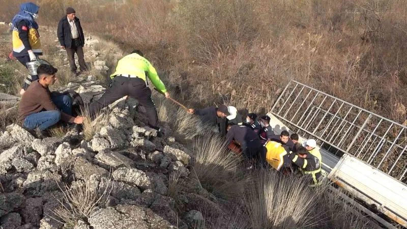 112 Acil Çağrı Merkezi’ne yapılan ihbarla olay yerine sağlık, itfaiye, polis ve jandarma ekipleri sevk edildi. Ekipler, kazada ağır yaralanan sürücünün dereden çıkartılması için seferber oldu. 13 kişi, yaralı sürücüyü dereden çıkartmak için birbirlerine tutunarak dakikalarca çaba sarf etti. Sopa ile yukarıdan destek veren trafik polisinin ayağından tutan küçük bir çobanın kurtarma çalışmasına yardım ettiği anlar objektiflere yansıdı.