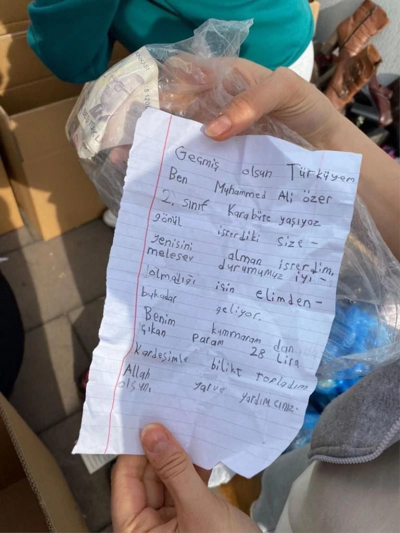 Kahramanmaraş merkezli 10 ilde etkili olan deprem sonrası yardım malzemeleri bölgelere aralıksız olarak gönderiliyor. Karabük’te de 8 yaşındaki Muhammed Ali Özer isimli çocuk, ailesinin deprem bölgelerine göndermek üzere hazırladığı malzemelerin içerisine kumbarasında biriktirdiği parayla birlikte bir de mektup bıraktı. Duygulandıran mektuba "Geçmiş olsun Türkiyem" diye yazarak başlayan Özer, "Gönül isterdi ki size yenisini alayım. Maalesef durumumuz iyi olmadığı için elimden bu kadarı geliyor. Benim kumbaramdan çıkan 28 lira. Kardeşimle birlikte topladık. Allah yar ve yardımcınız olsun" ifadelerini kullandı.