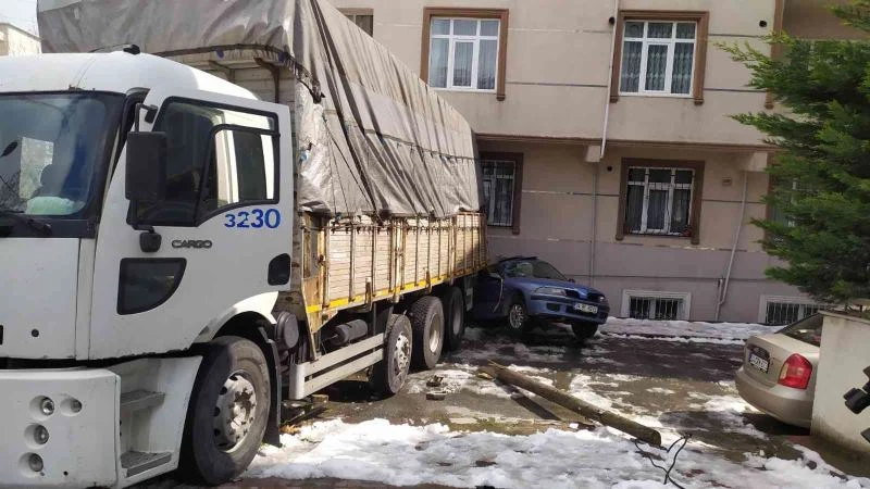 Olay Küçükçekmece Tevfikbey Mahallesi’nde saat 11.50 sıralarında meydana geldi. Edinilen bilgiye 16 SP 258 plakalı kamyon yokuş yukarı çıkmak istediği sırada araç arıza yaptı. Sürücünün rampada düzeltmeye çalıştığı kamyonun freni boşaldı. Önce 57 AAU 955 plakalı otomobile çarpan kamyon daha sonra elektrik direğini yerinden söktü. Ardından park halindeki 34 BF 6032 plakalı otomobille birlikte sürüklenen kamyon, apartmanın duvarına çarptı. İhbar üzerine olay yerine polis ekibi sevk edildi. Kazada şans eseri ölen ya da yaralanan olmadı. Kamyon ve otomobilin çarptığı binanın zemin ve 1. katındaki dairelerde hasar oluştu. Kamyonun kaza yaptığı o anlar ise kameraya yansıdı.