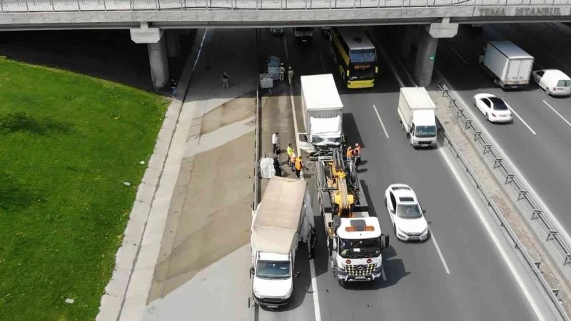 Küçükçekmece’de seyir halindeki kamyon, emniyet şeridinde duran içinde kimyasal madde bulunan bidonları taşıyan kamyona çarptı. Çarpışmanın etkisiyle kimyasal madde taşıyan kamyon metrelerce sürüklenirken, yüzlerce litre madde ise otoyola döküldü.