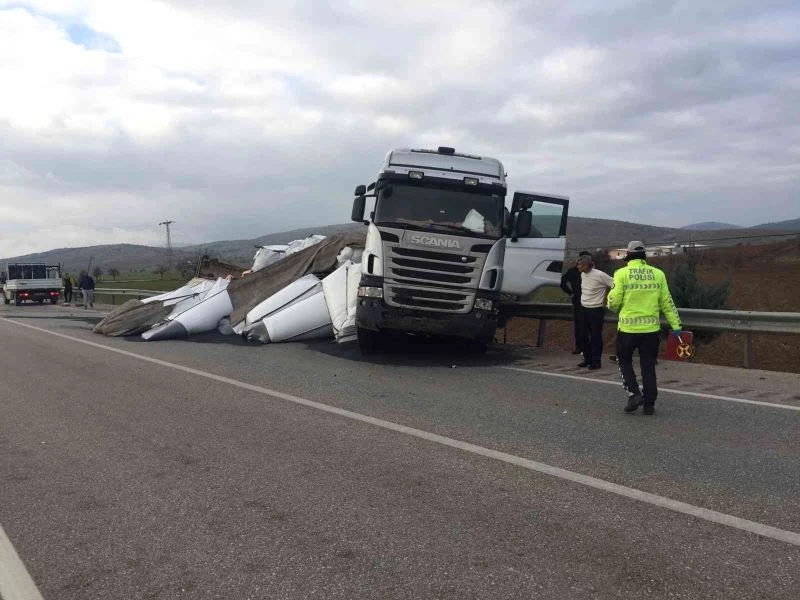 Manisa’nın Kula ilçesinde seyir halindeyken kontrolden çıkan tır, karşı şeride geçip bariyerlere çarparak durabildi. Kaza esnasında karşı yönden başka bir aracın gelmemesi olabilecek bir faciayı önlerken, tır sürücüsü de kazayı yara almadan atlattı.