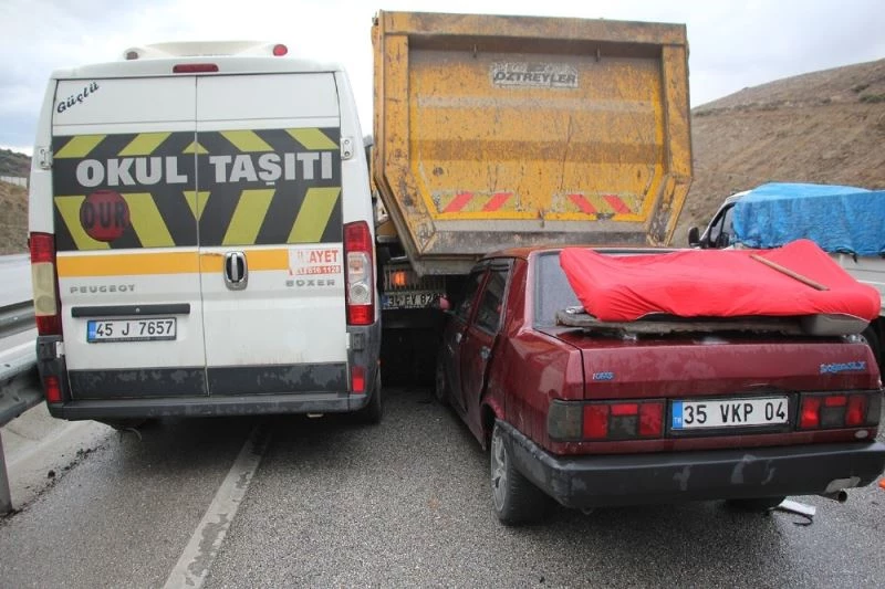 Manisa’nın Kula ilçesinde aynı yönde seyreden öğrenci servisi ile hafriyat kamyonu, hatalı sollama sebebi ile maddi hasarlı trafik kazasına karıştı. O kazanın hemen ardından aynı yönde seyreden bir otomobil de, kazayı son anda fark etmesi sebebi ile yağışlı havanın da etkisiyle kayganlaşan yolda duramayarak hafriyat kamyonuna arkadan çarptı. Zincirleme kazada otomobil sürücüsü araç içerisinde sıkışarak ağır yaralandı.