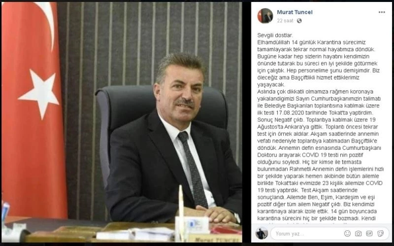 Sosyal medya hesabında açıklamalarda bulunan Başkan Tuncel, yaşadığı süreci dile getirdi. Tokat’ta yaptırdığı test sonucunu negatif çıktığını ifade eden Başkan Tuncel, Ankara’da külliyedeki toplantı öncesinde ikinci bir test yapıldığını belirterek, ”Sayın Cumhurbaşkanı’mızın talimatı ile Belediye Başkanları toplantısına katılmak üzere ilk testi 17.08.2020 tarihinde Tokat’ta yaptırdım. Sonuç negatif çıktı. Toplantıya katılmak üzere 19 Ağustos’ta Ankara’ya gittik. Toplantı öncesi tekrar test için örnek aldılar. Akşam saatlerinde annemin vefatı nedeniyle toplantıya katılmadan Başçiftlik’e döndük. Annemin defin esnasında Cumhurbaşkanı doktoru arayarak COVİD 19 testinin pozitif olduğunu söyledi. Hiç bir kimse ile temasta bulunmadan rahmetli annemin defin işlemlerini hızlı bir şekilde yaptık. Hemen akabinde bütün ailemle birlikte Tokat’taki evimizde 23 kişilik ailemize COVİD 19 testi yaptırdık. Test akşam saatlerinde sonuçlandı. Ailemde ben, eşim, kardeşim ve eşi pozitif diğer tüm ailem negatif çıktı. Biz kendimizi karantinaya alarak izole ettik. 14 gün boyunca da karantina sürecini hiç bir şekilde bozmadık. Kendi çocuklarımızla bile bir araya gelmedi. Bu toplantı belki de ilçemizi büyük bir felaketten korudu. Yoksa hasta olduğumuzu hasta olanları kimse bilmeyecekti. Rabbime hamdolsun ki hiç bir sıkıntılı bir durum söz konusu olmadan süreci tamamlandık. Elhamdülillah biz bu süreci çok küçük belirtilerle atlattık” ifadelerini kullandı.