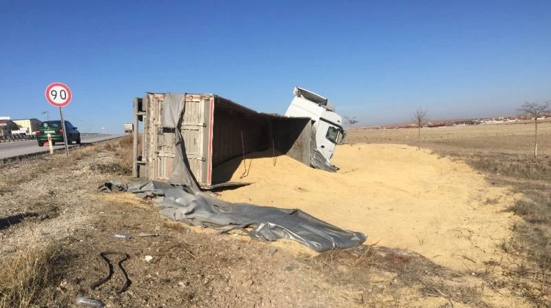 Kaza, Kulu ilçesi Tavşançalı Mahallesi mevkisinde meydana geldi. Edinilen bilgiye göre, Konya’dan Bursa’ya arpa nakli yapan A.Ü. idaresindeki 42 AZB 50 plakalı Mercedes marka tır, sürücüsünün direksiyon hakimiyetini kaybetmesi sonucu yol kenarına çıktı ve tırın kasası şarampole devrildi. Kasada yüklü olan arpalar geniş alana savrularak dökülürken, sürücü yaralandı. Yoldan geçen diğer sürücülerin ihbarı üzerine kaza yerine sağlık ekipleri sevk edildi. İlk tedavisi kaza yerinde yapılan sürücü Kulu Devlet Hastanesi Acil Servisine getirilerek tedavi altına alındı.