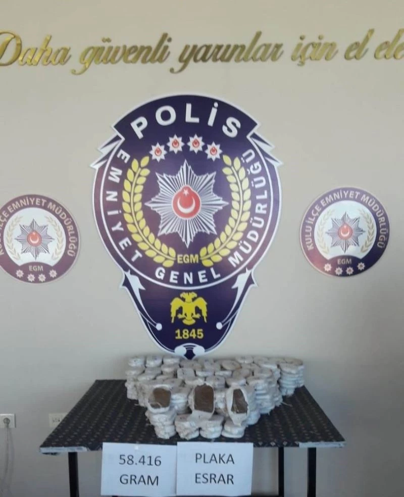 Konya’nın Kulu ilçesinde 58 kilogram esrar ile uyuşturucu hap ele geçirildi.