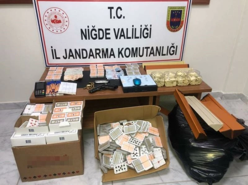 Niğde İl Jandarma Komutanlığı ekipleri Bor ilçesi Kemerhisar Kasabası Çayırlı Mahallesi’nde ihbar üzerine O.Ö. isimli şahsın kiralamış olduğu eve operasyon düzenledi. 13 kişiyi kumar oynarken ve 6 konsomatris kadını çalışırken suçüstü yakalayan ekipler, kumar oynamada kullanılan iskambil kağıtları, para, nakit temininde kullanmak için 1 adet pos cihazı, sigara ve alkol, tabanca ve tabancaya ait 13 adet fişek ele geçirdi. 19 şahıs hakkında Hıfzıssıhha Kanununa muhalefet ve yasadışı kumar oynamak suçlarından toplam 40 bin 432 TL idari para cezası kesildi, 1 kişiye ise adli işlem yapıldı.