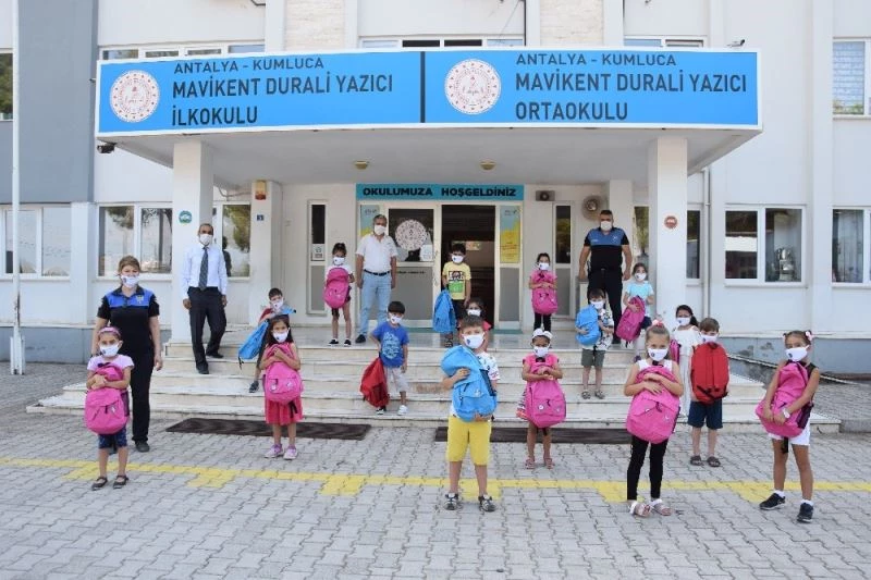 Kumluca İlçe Emniyet Müdürlüğüne bağlı Toplum Destekli Polis Büro Amirliği Ekipleri 1. Sınıf öğrencilerine içinde eğitim araç ve gereçleri olan çanta dağıttı