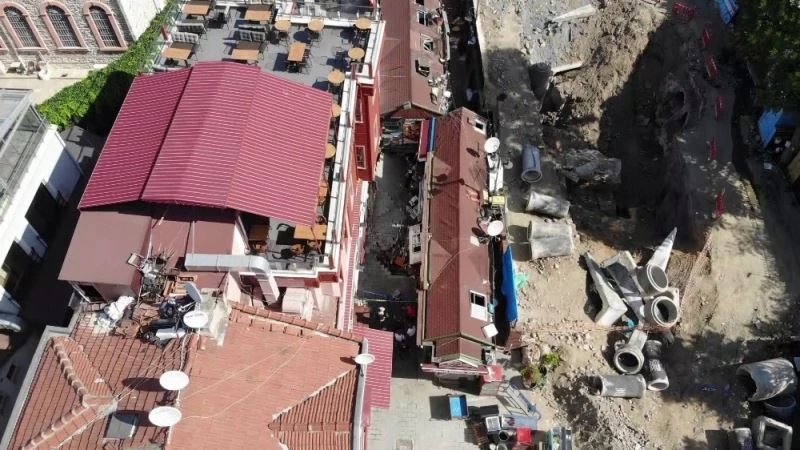 Beşiktaş Ortaköy’de kumpircilerin olduğu sokakta çöken yol havadan görüntülendi. Görüntülerde, yan tarafta bir inşaat alanın olduğu ve kazı yapıldığı görülüyor. Ekiplerin çalışmasının devam ediyor.