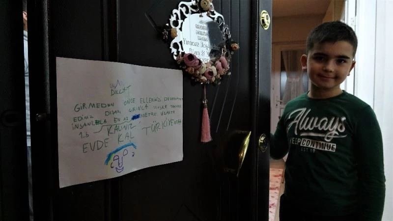 Mudanya ilçesinde yaşayan Ensar Türker, (8) korona virüse karşı aldığı tedbirlerle görenleri helal olsun dedirtti. Evinin kapısına astığı mesajda şunları yazdı. "Dikkat evimize girmeden önce lütfen ellerimizi dezenfekte edelim. Dışarıya çıkınca maske takalım aramızda en az 1,5 metre mesafe bırakalım. Evde kal Türkiye" mesajı verdi. Bu yaşta kurallara harfiyen uyan ve çevresine de sosyal mesaj veren Ensar Türker, "Kurallara uymayanlara örnek olmak istediğini söyledi."