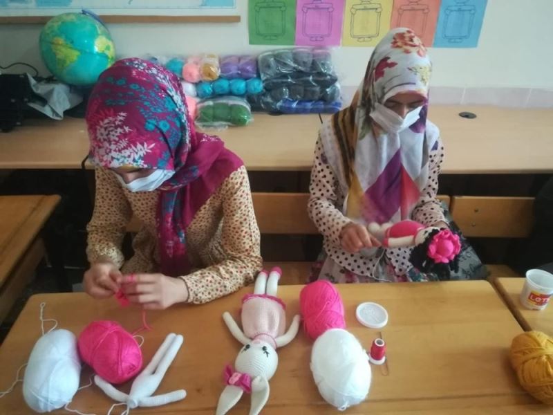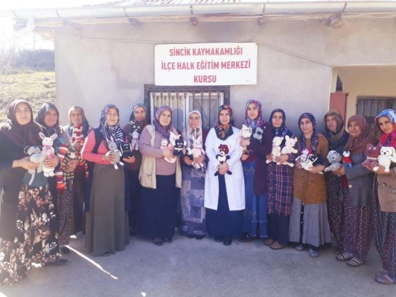 Adıyaman’ın Sincik ilçe Halk Eğitimi Merkezi bünyesinde açılan şiş ve tığ örücülüğü kursu kursiyerleri, ana sınıf öğrencileri için örgü oyuncak yapıyor.
