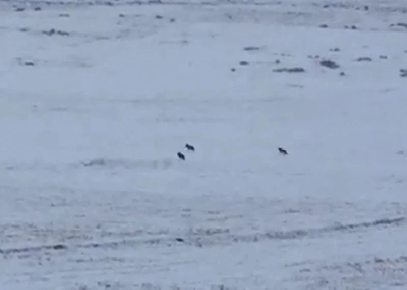Ardahan’da karla kaplı alanda görülen 4 kurt, vatandaşlar tarafından cep telefonu kamerasıyla görüntülendi.