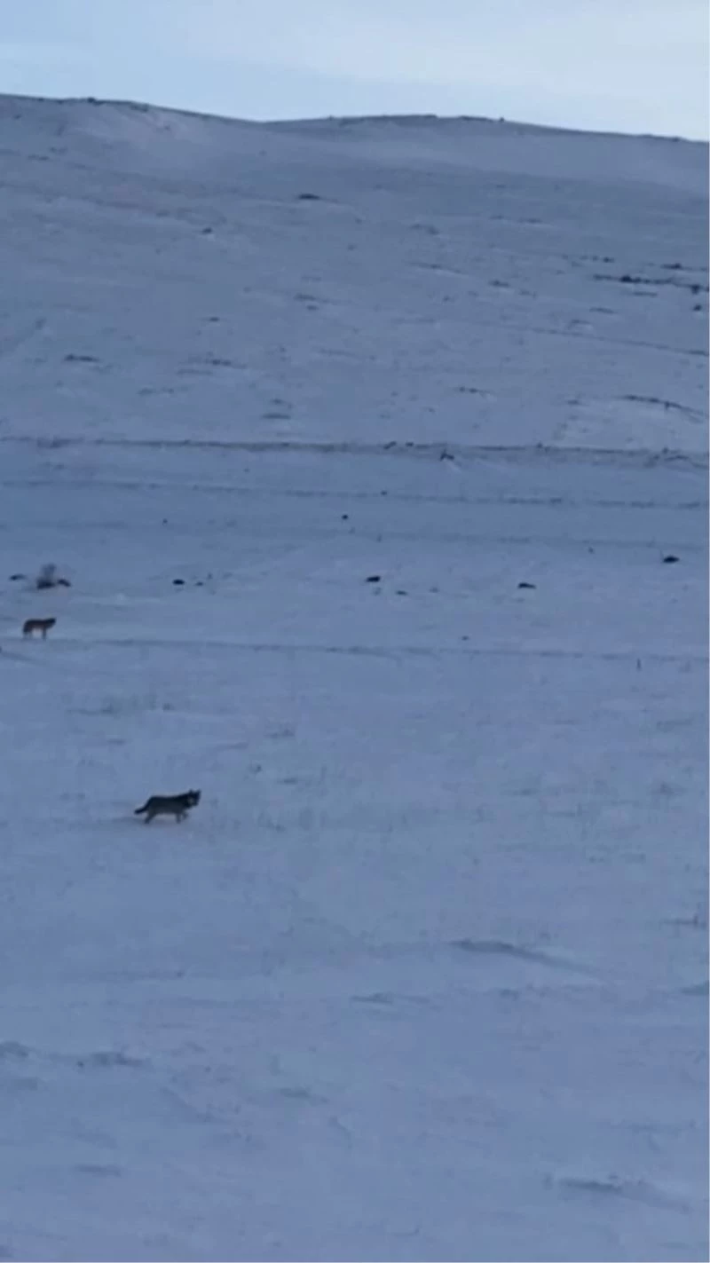 Ardahan’da kar yağışı ve soğuk hava nedeniyle yiyecek bulmakta zorlanan kurtlar, yerleşim yerlerine kadar indi.