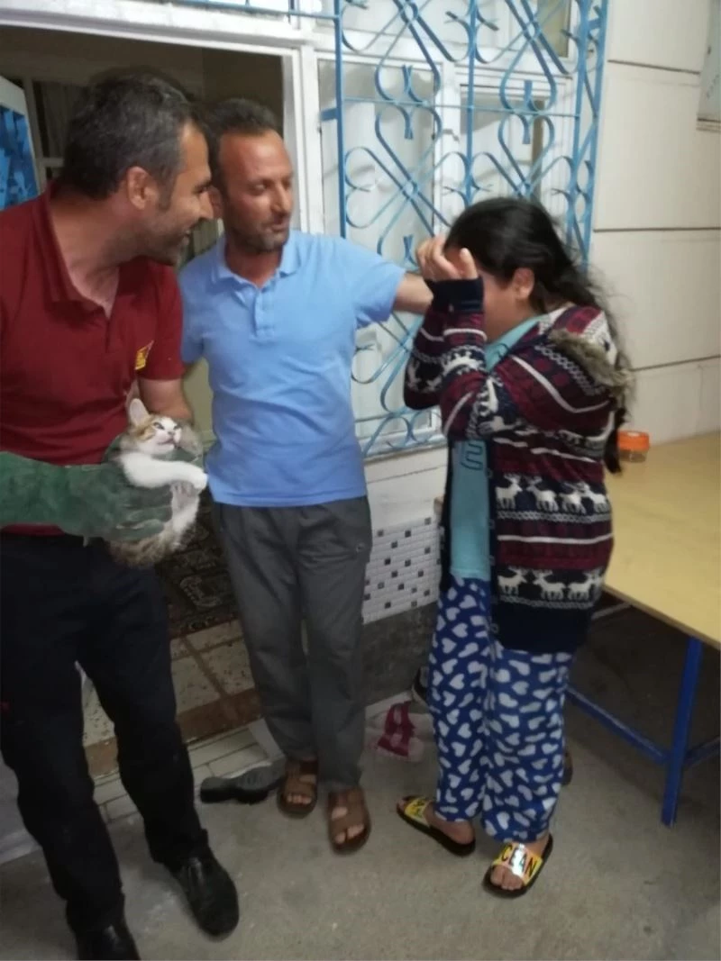 Adıyaman’da, bir evin havalandırma boşluğuna düşen kedi itfaiye ekipleri tarafından kurtarılırken kediyi beslen kız sevinç gözyaşları döktü.