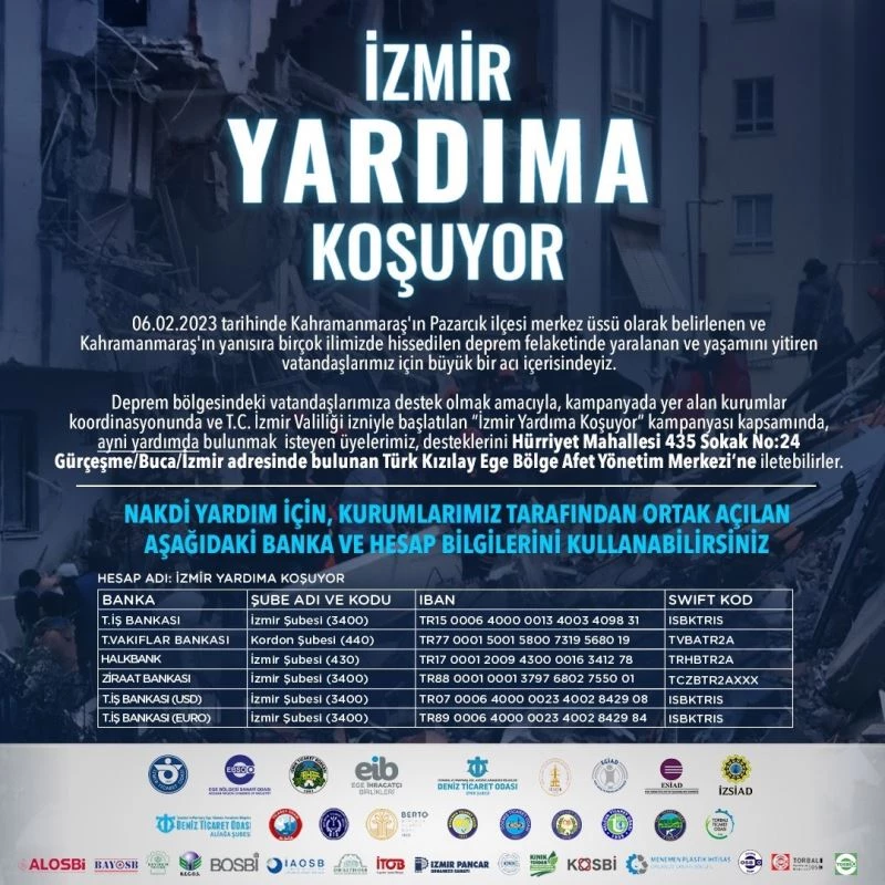 İzmir iş dünyası, Kahramanmaraş merkezli 10 ilde yıkıma neden olan depremin ardından “İzmir Yardıma Koşuyor” kampanyasını başlattı. İzmir Valiliği koordinasyonunda bir araya gelen 19 oda, borsa ve sivil toplum kuruluşu ile 16 organize sanayi bölgesi, afet bölgesine gönderilmek üzere nakdi ve ayni yardım topluyor.