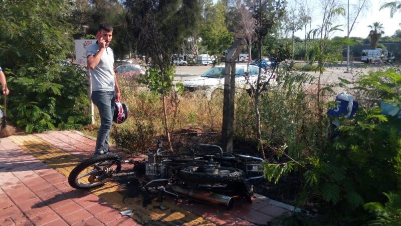 Antalya’da seyir halindeyken alev alan motosikletin sürücüsü yanmaktan son anda kurtuldu. Alev topuna dönen motosikleti itfaiye söndürdü.