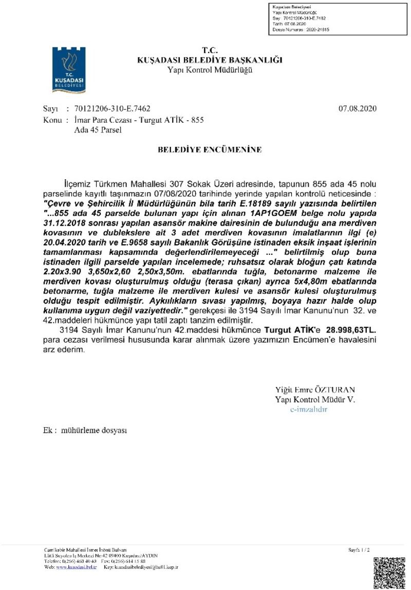 Belediye Yapı Kontrol Müdürlüğü ekiplerince Yapı Kayıt Belgesi sonrası sadece 855 ada 45 parselde yer alan bir adet bloğun en üst katında merdiven üzeri beton imalatlar ve ayrıca asansör kulesi 3194 sayılı İmar Kanunu’nun 32. ve 42. maddeleri uyarınca mühürlenerek yapı tatil zaptı düzenledi. Aynı zamanda aykırılığın tespiti sonrası imar para cezası hesaplaması yapılarak, 3194 sayılı İmar Kanunu’nun 42. maddesi uyarınca Belediye Encümeni’ne dosya sevk edildi. Yapı Kontrol birimi tarafından ruhsatsız olan kısma mühür asılıp yapılan işlemin detaylarının yazılı olduğu belge de söz konusu yere asıldı. Konuyla ilgili tutanakların bir kopyası ise mahalle muhtarlığına bırakıldı. Kuşadası Belediye Başkanı Ömer Günel, söz konusu inşaatlarla ilgili şikayetlerin önceki dönemlere ait olduğunu belirterek, “ Belediyemize bu konuyla ilgili müfettiş geldi ve inceleme yapıyor. Bu konu tamamen önceki dönemlere ait bir konu “ dedi.