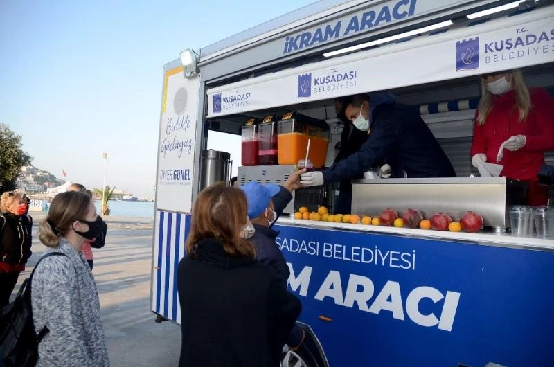 Sosyal belediyecilik alanında gerçekleştirdiği çalışmalarla dikkat çeken Kuşadası Belediyesi tarafından 14 Ekim’de faaliyete başlatılan mobil ikram aracı, vatandaşlara 7 gün 24 saat hizmet vermeye devam ediyor. İçerisinde yer alan mutfak ünitesi, buzdolabı, çay, kahve makinesi ve meyve suyu sıkacağı gibi ekipmanlar sayesinde çeşitli etkinliklerde ve özel günlerde vatandaşlara hızlı ve kolay bir biçimde ulaşma olanağı sağlayan mobil ikram aracının son durağı, İsmail Cem Dostluk ve Barış Meydanı oldu.