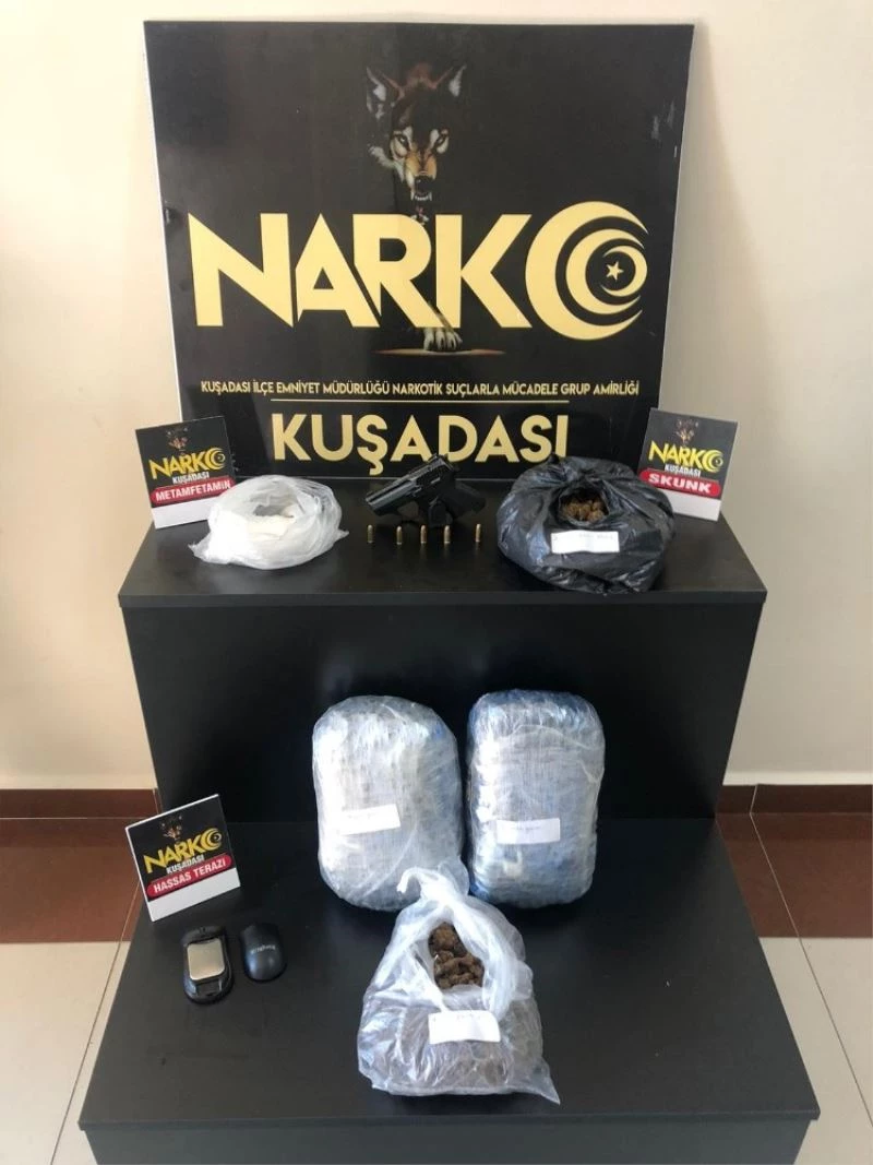 Aydın’ın Kuşadası ilçesinde narkotik ekiplerinin gerçekleştirdiği operasyonda 3 kiloya yakın skunk ile metanfetamin ele geçirildi. Operasyonda ayrıca 15 ayrı suçtan aranan ve 8 yıl 8 ay kesinleşmiş hapis cezası bulunan bir zanlı da yakalandı.