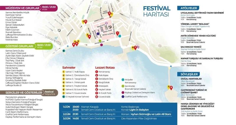 Festival çerçevesinde ayrıca 12 Haziran Pazar günü Aşçılar Federasyonu’na bağlı profesyonel şefler tarafından 4 tonluk dev kazanda pişirilecek olan etli nohutlu bulgur pilavı katılımcılara ikram edilecek. Ayhan Sicimoğlu’nun, uygulamalı bir atölye eşliğinde Zeytinyağı Tadım Semineri yapacağı festivalde, zeytinyağı hakkında öğretici ve keyifli bir sohbet de gerçekleşecek. Aynı zamanda festivalde söyleşiler, paneller, sokak gösterileri, kabareler, konserler, pandomim gösterileri, interaktif grafity performansları, kaykay gösterisi, resim ve fotoğraf sergileri gibi pek çok etkinlik gerçekleşecek.