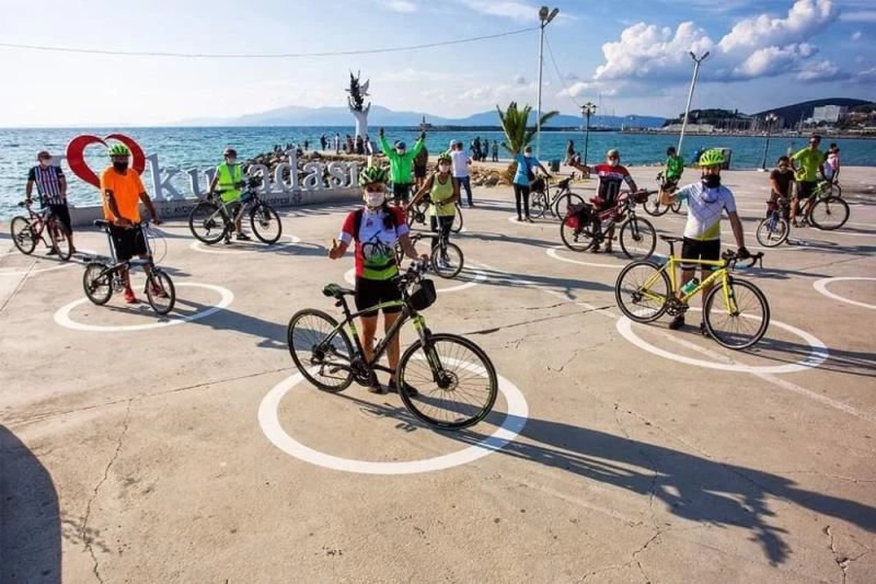 Kuşadası Bisikletliler Derneği tarafından gerçekleştirilen etkinlikte bisikletli grup, sahil bandı üzerindeki İsmail Cem Barış ve Dostluk Meydanı’nda bir araya geldi. 30 kişilik bisikletli grup daha sonra sahilden Pazar yeri arasında oluşturulan parkurda bisiklet sürdü. Korona virüs tedbirleri kapsamında etkinliğe maske takarak katılan bisikletli grubun, sosyal mesafeye uygun hareket ettiği gözlendi.