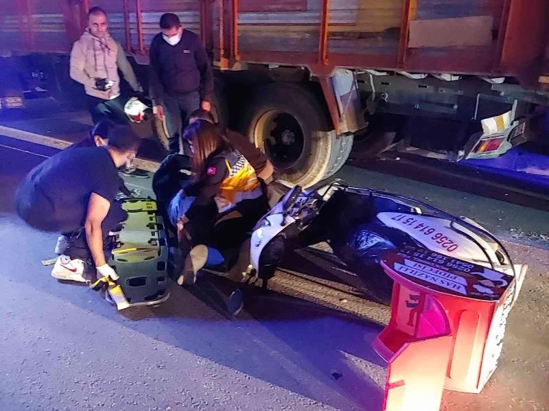 Aydın’ın Kuşadası ilçesi çevre yolunda meydana gelen trafik kazasında kamyona çarpan motosiklet sürücüsü 1 yaralandı.