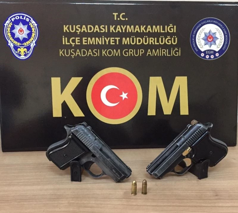 Edinilen bilgiye göre; Kuşadası İlçe Emniyet Müdürlüğü Kaçakçılık ve Organize Suçlarla Mücadele Grup Amirliği ekipleri, öğle saatlerinde durumundan şüphelenilen aracı, Toprak Kavşağında kontrollü olarak durdurdu. Araçtan indirilen ve yapılan sorgulamasında V.K. olduğu tespit edilen şüphelinin üstünde ve aracın arka koltuğunun içine gizlenmiş vaziyette 2 adet ruhsatsız tabanca, 2 adet bu tabancalara ait şarjör ve 2 adet fişek ele geçirildi.