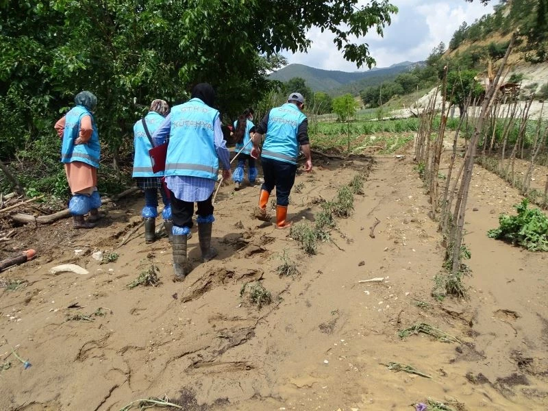 Tetik deresinin taşması sonucu bazı evleri su bastığı, araçların sürüklendiği ve ekili alanlarda büyük hasar oluştuğu Hasanlar köyünde, İlçe Tarım ve Orman Müdürlüğü, İlçe Özel İdaresi ve Orman İşletme ekipleri çalışmalarını sürdürüyor.