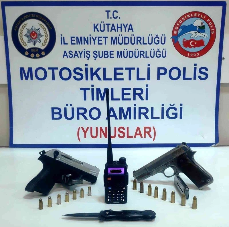 Kütahya’da Yunus Timlerince bir araçta bulunan iki kişinin üzerinde yapılan aramada 2 ruhsatsız tabanca ve tabancalara ait 15 fişek ile telsiz ele geçirildi.
